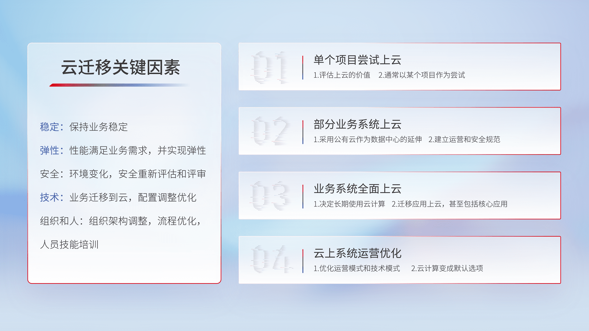 结合实际业务,,从规划设计、、、、云平台选型、、云原生改造、、数据迁移、、集成交付,,,迁移全过程为客户识别最佳上云路径,,,做好风险识别管理,,,设计网络架构、、、身份权限、、安全审计合规、、、、操作审计、、日志审计、、、监控告警策略、、、多站点容灾设计等,,,,对云上基础设施进行整体规划,,,,提升IT治理水平,,以满足弹性、、、高可用、、、、高性能的需求。。