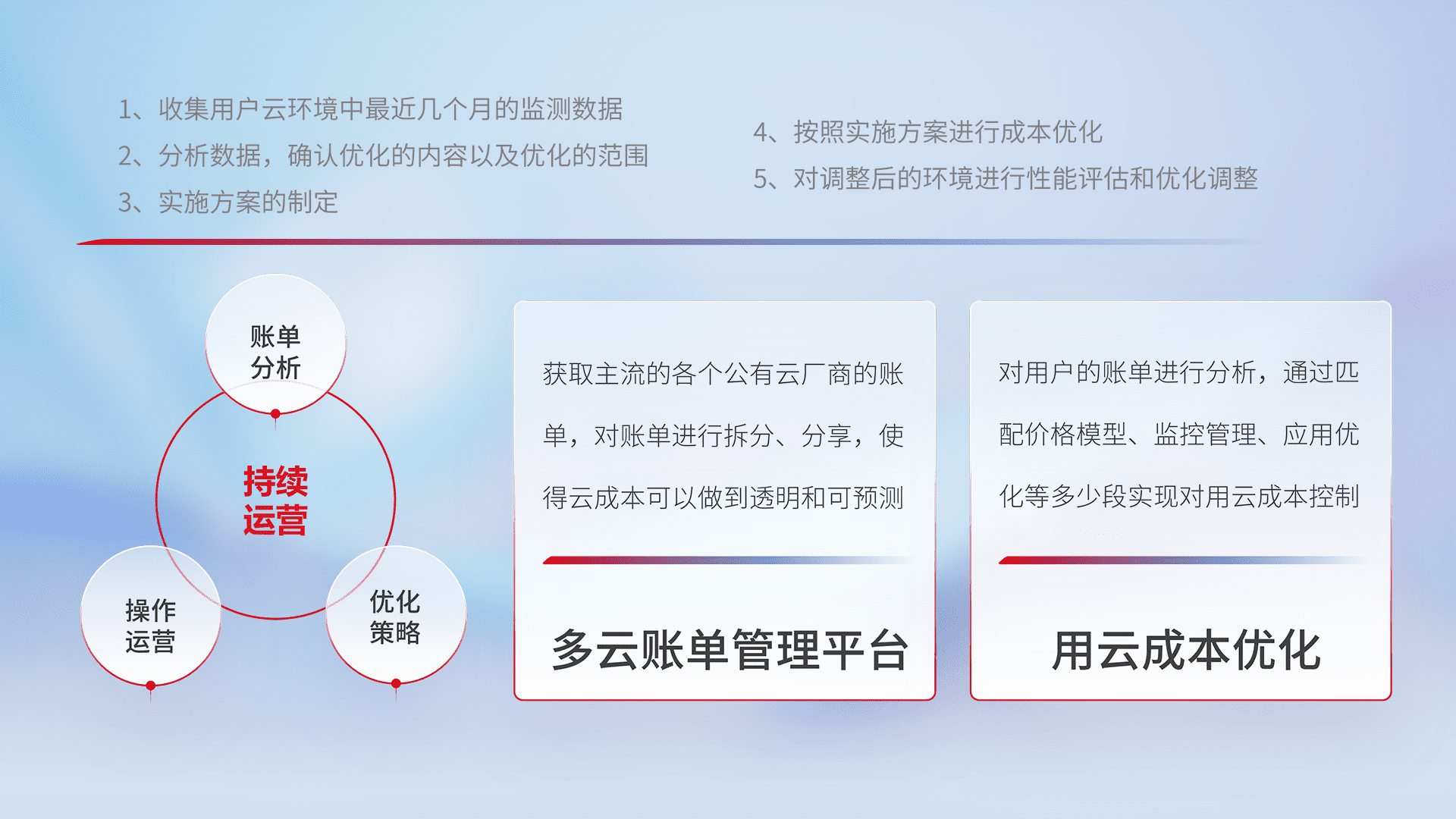通过多云纳管,,,以统一的资源数据模型把客户的云资源进行抽象和封装,,,,进而实现对多云资源的统一操作,,,保障云资源管理的可靠性、、、、稳定性与可用性。。。。量身定制化运维内容,,,配置、、开发运维、、、、补丁管理、、、备份、、、、监控、、、、认证和访问管理、、审计和日常巡检等,,,,保障在用云过程中的可靠度,,稳定度以及高可用率。。